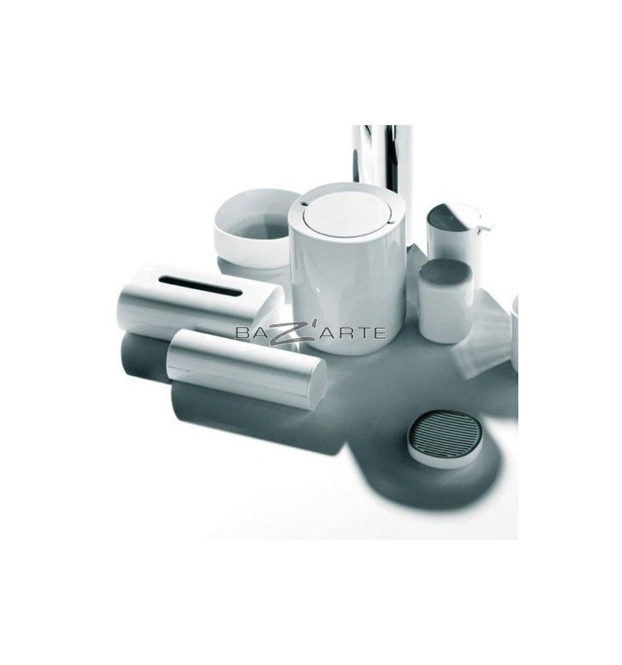 Liquid soap dispenser. Faithful to the minimalist style that characterizes all his work, Piero Lissoni has designed for Alessi a full range of toiletry products, starting from a classical form. The choice of the basic form for the Collection "Birillo" is an "imperfect square." The base is hidden to give the impression that the object floats. The container, in thick thermoplastic PMMA with a gray finish mirror, can be used for all types of toiletries, cosmetics, hair brushes, hairgrips, etc.